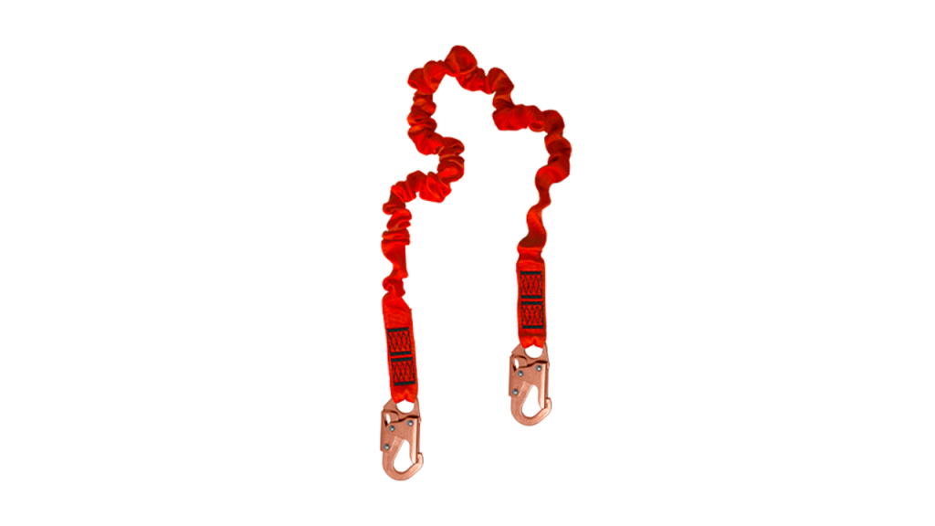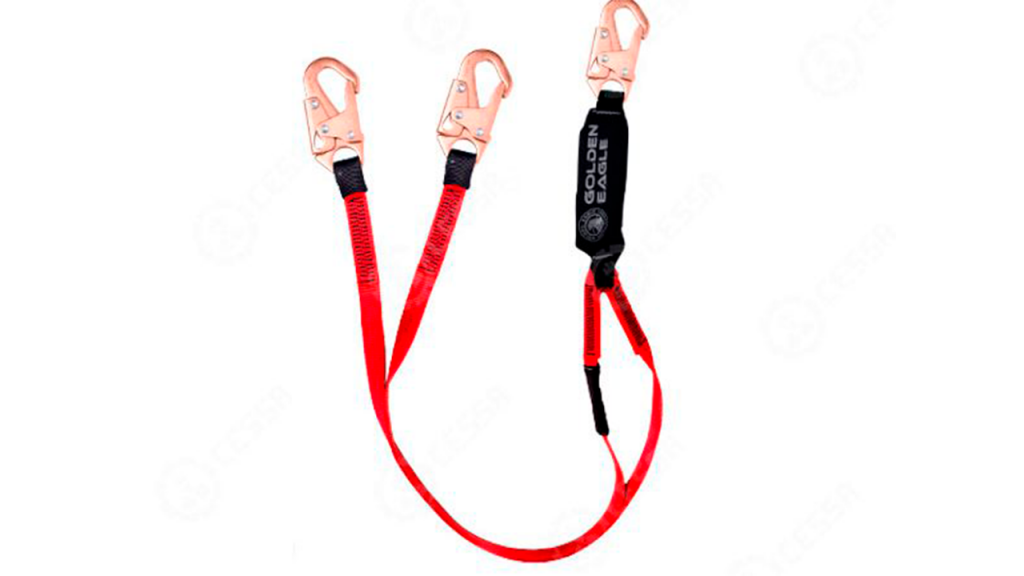 Dispositivo de seguridad para trabajos en altura que ayuda a disminuir la fuerza de impacto en caso de caída, permitiendo una conexión segura al punto de anclaje.